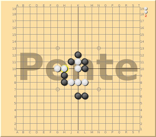 Comment "Pente is a fast game that is usually won by the player who mounts the first attack. However, White is overly aggressive here. Should I answer with an equally aggressive move and capture a White pair with 7. ... H12? Of course not. It would only set up more attacks by White." ... K11 8. M13 ...